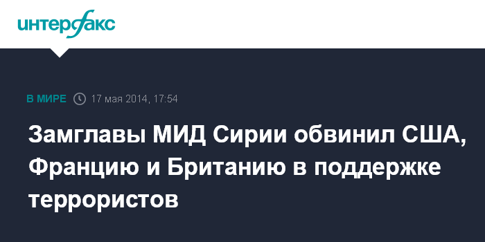 Москва. 17 мая. INTERFAX.RU - Замминистра иностранных дел Сирии Фейсал Микдад считает, что США, Франция и Великобритания оказывают поддержку террористам, действующим на сирийской территории, сообщают в субботу ливанские СМИ. Дипломат заявил в статье, что эти страны выступают против реформ в Сирии, направленных на продвижение демократии, прав человека и развития правового государства в Сирии.