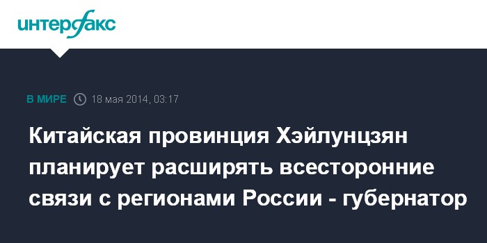 "Руководство наших стран уделяет большое внимание отношениям между регионами Китая и России. Мы надеемся, что в ходе визита российского президента в Китай главы наших государств обсудят вопросы регионального сотрудничества, что будет способствовать его дальнейшему развитию и расширению его географии", - сказал глава провинциального правительства.