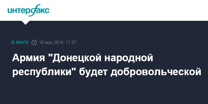 Москва. 18 мая. INTERFAX.RU - Армия "Донецкой народной республики" (ДНР) будет формироваться преимущественно на добровольной основе, заявил сопредседатель правительства ДНР Мирослав Руденко. "Мы сейчас делаем ставку на добровольную основу. Армию, скорее всего, будем по такому же принципу комплектовать. Добровольцы лучше мотивированы для защиты своей территории", - сказал он "Интерфаксу".