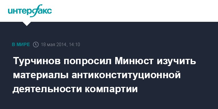 Москва. 18 мая. INTERFAX.RU - Председатель Верховной Рады, и.о. президента Украины Александр Турчинов ждет от суда решения в вопросе деятельности Коммунистической партии Украины (КПУ). "Сегодня подписал официальное письмо на Министерство юстиции Украины, где предлагаю министру немедленно рассмотреть все материалы, предоставленные Службой безопасности Украины, Генеральной прокуратурой относительно незаконной антиконституционной деятельности Коммунистической партии", - сообщил он в Киеве в воскресенье.