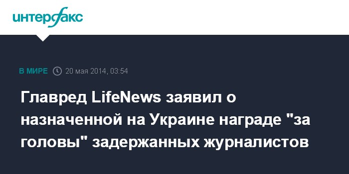 Москва. 20 мая. INTERFAX.RU - Главный редактор телеканала LifeNews заявил в интервью радистанции "Русская служба новостей", что на Украине "за головы" задержанных журналистов телеканала назначено вознаграждение в 20 тысяч долларов.