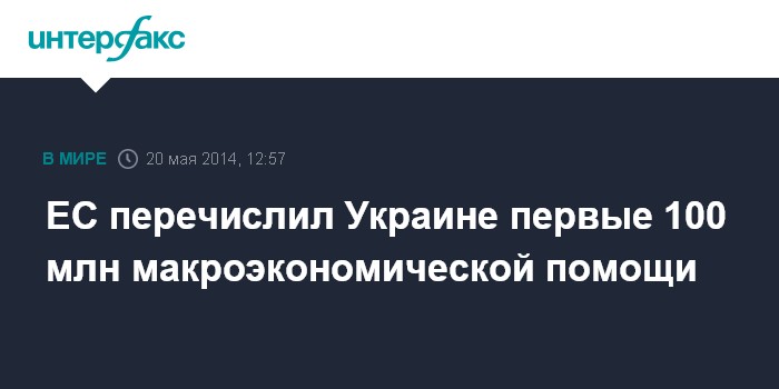 Москва. 20 мая. INTERFAX.RU - Европейский Союз перечислил Украине первый транш макроэкономической помощи в размере 100 млн евро, сообщил вице-президент Европейской комиссии Сийм Каллас.