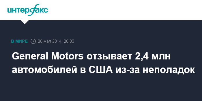 Москва. 20 мая. INTERFAX.RU - Крупнейший американский автопроизводитель General Motors Co. отзывает 2,42 млн автомобилей в США, сообщается в пресс-релизе компании, обнародованном во вторник.