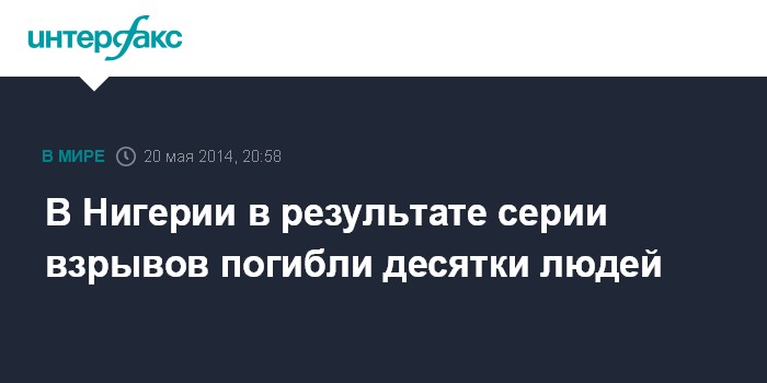 Москва. 20 мая. INTERFAX.RU - По меньшей мере 46 человек погибли и еще почти столько же получили ранения в результате серии взрывов в городе Джос в центральной части Нигерии, сообщает во вторник BBC News.