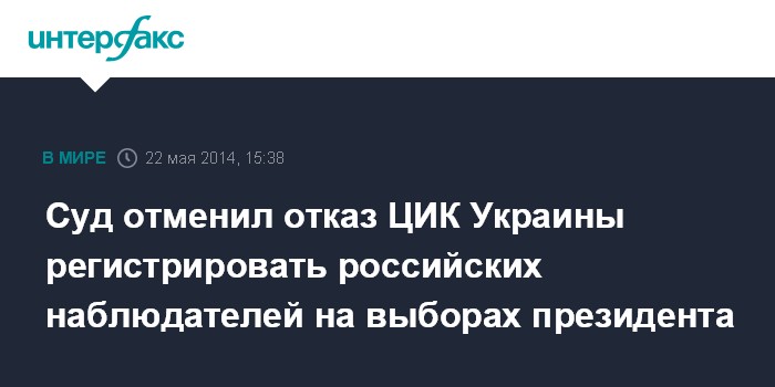 Москва. 22 мая. INTERFAX.RU - Киевский апелляционный административный суд отменил постановление Центризбиркома Украины об отказе в регистрации российских наблюдателей от организации "Европейская платформа за демократические выборы", сообщил замглавы ЦИК Андрей Магера.