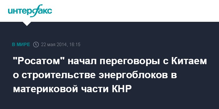 Москва. 22 мая. INTERFAX.RU - "Росатом" начал переговоры с Китаем о строительстве энергоблоков в материковой части КНР, сообщил журналистам глава "Росатома" Сергей Кириенко в кулуарах Петербургского международного экономического форума в четверг.