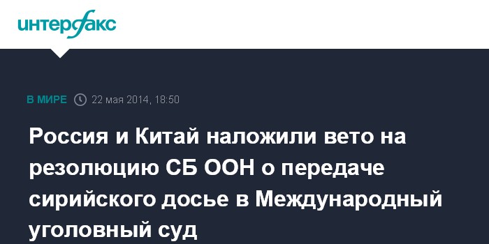 Москва. 22 мая. INTERFAX.RU - Россия и Китай в четверг наложили вето на проект резолюции СБ ООН о передаче в Международный уголовный суд досье, предусматривающее начало расследования по фактам возможного совершения военных преступлений в Сирии.