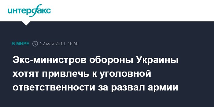Москва. 22 мая. INTERFAX.RU - Главное управление надзора за соблюдением законов в военной сфере Генеральной прокуратуры Украины внесло в Единый реестр досудебных расследований сведения о служебной халатности бывших руководителей Министерства обороны и Генерального штаба Вооруженных сил Украины.