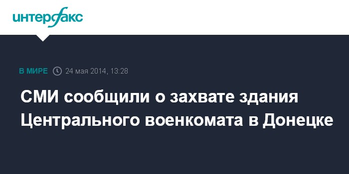 Москва. 24 мая. INTERFAX.RU - Вооруженные активисты самопровозглашенной "Донецкой народной республики" (ДНР) захватили здание Центрального городского объединенного военкомата в Донецке вечером 23 мая, сообщает в субботу издание "Новости Донбасса". "Около 50 человек с оружием, одетые в камуфляжную форму, окружили здание военного комиссариата. Данный факт внесен в Единый реестр досудебных расследований по ст. 341 УК Украины (захват государственных или общественных зданий или сооружений)", - говорится в сообщении.