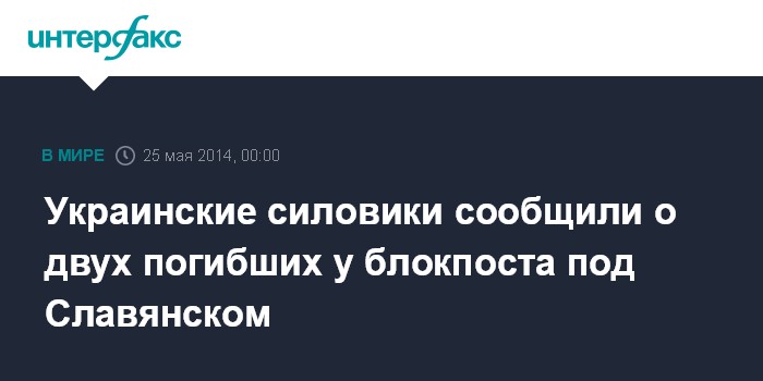 Москва. 25 мая. INTERFAX.RU - Два украинских силовика погибли, четверо ранены в результате попытки штурма вооруженными людьми блокпоста в Славянске, сообщил с субботу вечером в своем фейсбуке координатор группы "Информационное сопротивление" Дмитрий Тымчук.