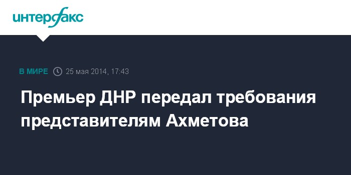 Москва. 25 мая. INTERFAX.RU - Премьер-министр "Донецкой народной республики" (ДНР) Александр Бородай заявил о начале переговоров с бизнесменом Ринатом Ахметовым. "Мы передали требования Донецкой народной республики представителям Рината Ахметова. Процесс переговоров пошел, и мы надеемся, что завтра будет положительный результат", - заявил он.