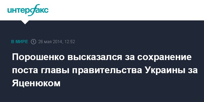 Москва. 26 мая. INTERFAX.RU - Одерживающий, по предварительным данным, победу на президентских выборах на Украине Петр Порошенко высказал мнение, что премьер-министр Арсений Яценюк сохранит свой пост. Такое заявление Порошенко заявил на брифинге в понедельник в Киеве.