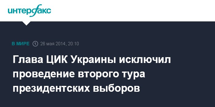 Москва. 26 мая. INTERFAX.RU - Глава Центральной избирательной комиссии Украины Михаил Охендовский заявляет, что необходимости в проведении второго тура президентских выборов нет.