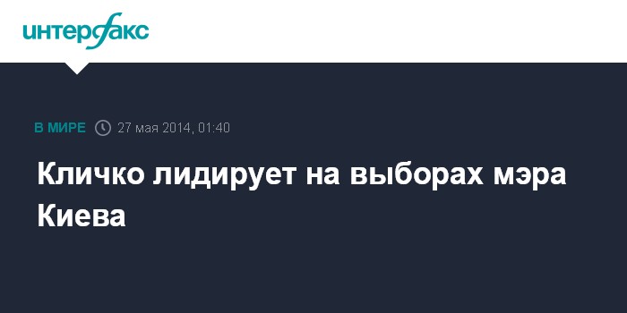 Москва. 27 мая. INTERFAX.RU - Согласно предварительным данным обработки 240 из 1083 участков на местных выборах в Киеве, лидер партии "УДАР" Виталий Кличко набирает 55,7% голосов на выборах мэра украинской столицы.