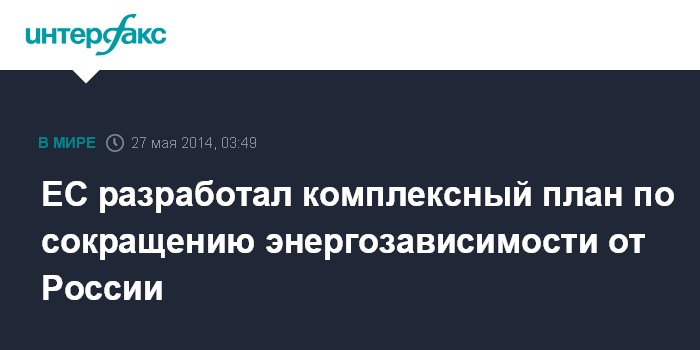 Москва. 27 мая. INTERFAX.RU - Евросоюз разработал "Комплексный план по сокращению энергозависимости ЕС", направленный на снижение рисков ограничения поставок из-за проблем с транзитом, сообщает газета "Коммерсант" во вторник.
