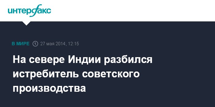 Москва. 27 мая. INTERFAX.RU - Истребитель индийских ВВС МиГ-21 потерпел во вторник крушение в штате Джамму и Кашмир в округе Анантнаг на севере Индии, сообщает телеканал NDTV.