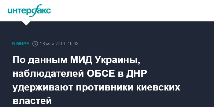 Москва. 28 мая. INTERFAX.RU - МИД Украины заявил, что четверо иностранцев - членов специальной мониторинговой миссии ОБСЕ захвачена противниками киевских властей в Донецкой области. Он не конкретизировал, кто именно стоит за захватом членов группы наблюдателей ОБСЕ