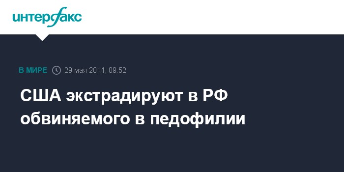 Москва. 29 мая. INTERFAX.RU - США выдадут России Владимира Летунова, заочно обвиняемого в серии преступлений против половой неприкосновенности несовершеннолетних, сообщил представитель столичного главка СКР. Сегодня Летунов прибудет из Нью-Йорка в московский аэропорт "Шереметьево".