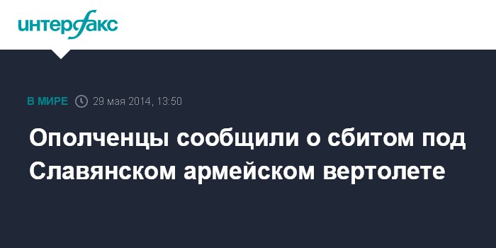 Москва. 29 мая. INTERFAX.RU - Ополченцы сбили вертолет украинской армии в поселке Мандрычино под Славянском, сообщили "Интерфаксу" в штабе народного ополчения.