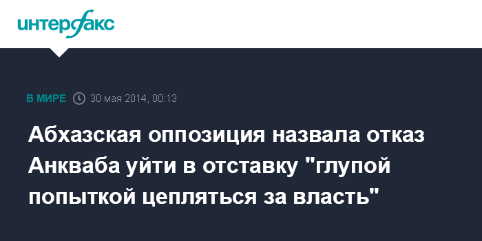 Москва. 30 мая. INTERFAX.RU - Оппозиция в Абхазии назвала реакцию президента Абхазии Александра Анкваба на требования о его отставке "глупой попыткой цепляться за власть".