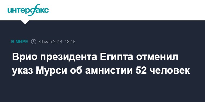 Москва. 30 мая. INTERFAX.RU - Временно исполняющий обязанности главы египетского государства Адли Мансур аннулировал указ бывшего президента Мухаммеда Мурси об амнистии 52 человек, сообщает египетское агентство MENA.