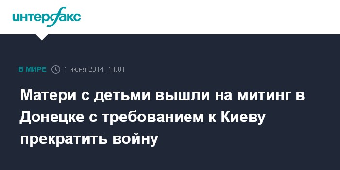Москва. 1 июня. INTERFAX.RU - В День защиты детей на площади Ленина в Донецке на митинг вышли мамы с детьми в знак протеста против проведения спецоперации украинских силовиков.