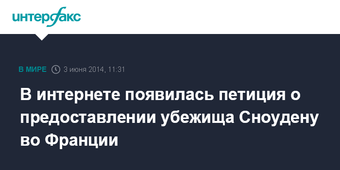 Москва. 3 июня. INTERFAX.RU - Французский журнал L'Express опубликовал в интернете петицию, призывающую президента страны Франсуа Олланда предоставить политическое убежище экс-сотруднику американских спецслужб Эдварду Сноудену.