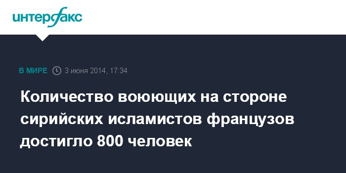 Москва. 3 июня. INTERFAX.RU - Количество граждан Франции, вовлеченных в конфликт в Сирии, достигло 800 человек, из них около 30 стали его жертвами, цитирует во вторник французский телеканал BFM TV главу французского правительства Манюэля Вальса.