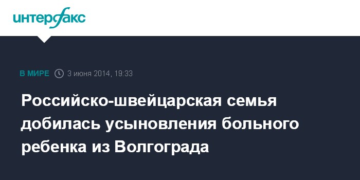 Москва. 3 июня. INTERFAX.RU - Верховный суд разрешил российско-швейцарской семье Пошон усыновить тяжелобольного мальчика из Волгограда, сообщает во вторник пресс-служба уполномоченного по правам ребенка в России Павла Астахова.