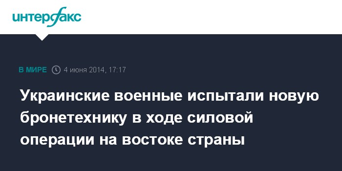 Москва. 4 июня. INTERFAX.RU - Украинские военные в ходе силовой операции на востоке страны испытали новые БТР-4Е, поступившие на вооружение армейских подразделений, заявили в госконцерне "Укроборонпром".