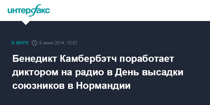 Камбербэтч зачитает оригинальные сводки новостей BBC от 6 июня 1944 года на Radio 4 BBC. Новости будут зачитаны в то же время, в какое они транслировались по радио 70 лет назад. Первый выход Камбербэтча в эфир запланирован на 8:00 по местному времени (11:00 по московскому).