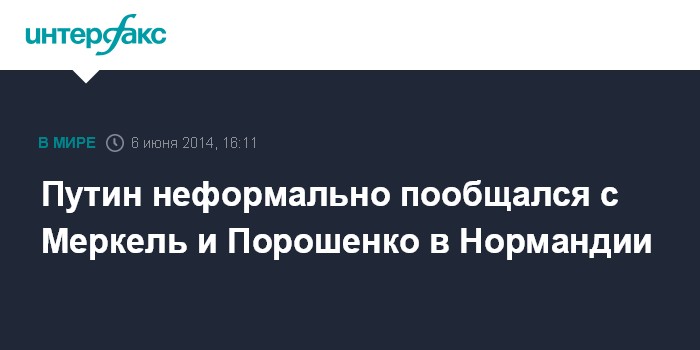 Москва. 6 июня. INTERFAX.RU - Неформальное общение канцлера ФРГ Ангелы Меркель, президента РФ Владимира Путина и избранного президента Украины Петра Порошенко состоялось в Нормандии в пятницу.