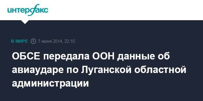 Москва. 7 июня. INTERFAX.RU - ОБСЕ передала ООН предварительные выводы миссии о произошедшей в Луганске несколько дней назад воздушной атаке, сообщил в субботу вечером сайт самопровозглашенной Луганской народной республики.