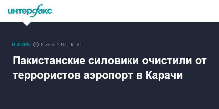 Москва. 9 июня. INTERFAX.RU - Силовые структуры Пакистана освободили от боевиков аэропорт в Карачи, сообщила газета DAWN со ссылкой на представителя армии.
