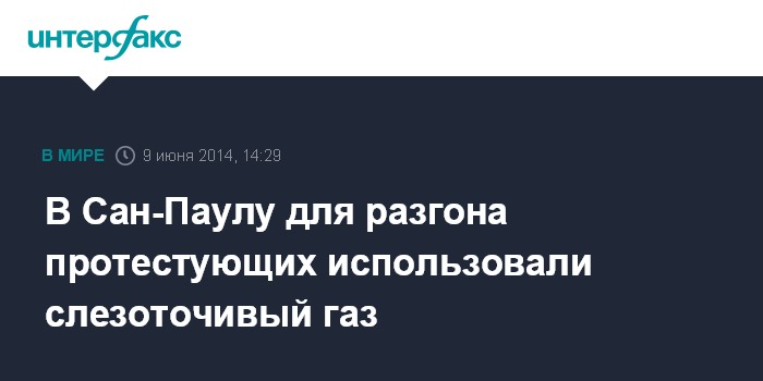 Москва. 9 июня. INTERFAX.RU - Полиция Бразилии использовала слезоточивый газ для разгона протестующих Сан-Паулу, за три дня до открытия чемпионата мира по футболу.