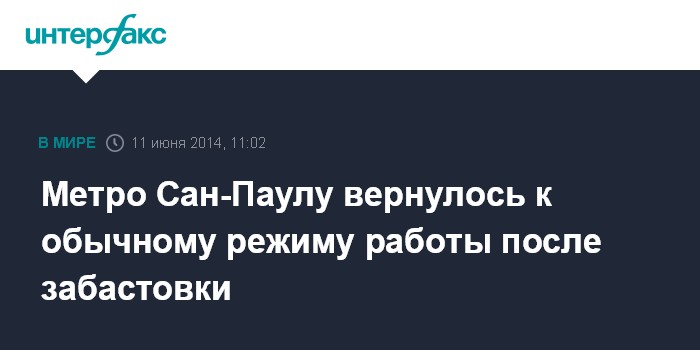 Москва. 11 июня. INTERFAX.RU - Метрополитен бразильского города Сан-Паулу возобновил работу в обычном режиме после того, как его работники после пяти дней забастовки приняли решение приостановить ее в преддверие ЧМ-014, сообщает в среду агентство Associated Press.