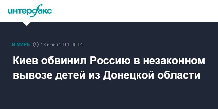 "По проверенной генеральным консулом Украины в Ростове-на-Дону и подтвержденной компетентными органами Украины информации, 12 июня российская сторона незаконно позволила перевезти на территорию РФ без соответствующих разрешительных документов, а лишь по копиям свидетельств о рождении, 16 детей-сирот из группы граждан Украины, похищенных в городе Снежном вооруженными представителями так называемой "ДНР", - говорится в заявлении МИД Украины, обнародованном в четверг вечером.