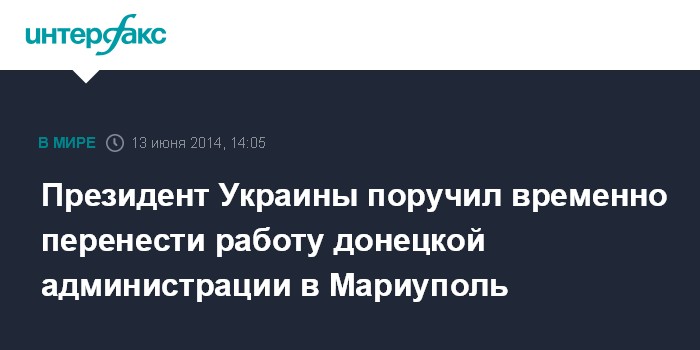 Москва. 13 июня. INTERFAX.RU - Президент Украины Петр Порошенко поручил главе Донецкой областной государственной администрации Сергею Таруте временно перенести офис облгосадминистрации в Мариуполь.