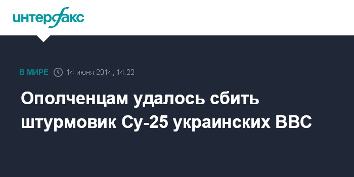 Москва. 14 июня. INTERFAX.RU - Ополченцы из Горловки (Донецкая область) сообщают о сбитом самолете украинской армии Су-25, который в 4:30 утра по киевскому времени нанес авиаудар по зданию горуправления внутренних дел.