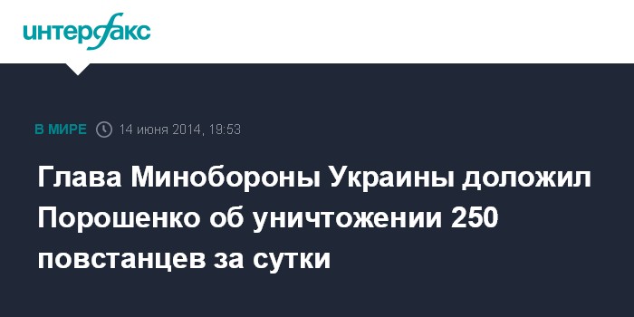 Москва. 14 июня. INTERFAX.RU - Исполняющий обязанности министра обороны Украины Михаил Коваль заявил об уничтожении за последние сутки в зоне проведения силовой операции более 250 ополченцев, значительная часть которых, по его утверждению, являются российскими гражданами, сообщает пресс-служба президента Украины.