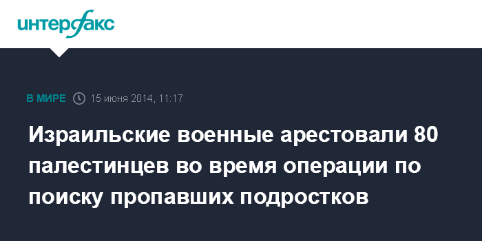 Израиль также объявил, что приступил к интенсивным поискам пропавших школьников, официальные представитель Палестины заявили о готовности оказать содействие. По данным израильских СМИ, среди задержанных активисты ХАМАС, "Исламского джихада" и других организаций.
