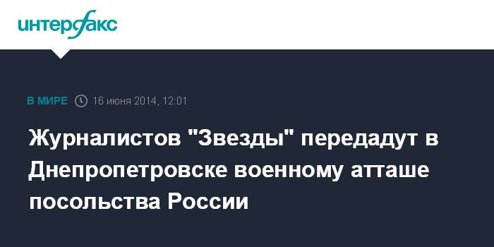 Москва. 16 июня. INTERFAX.RU - Украинская сторона в понедельник передаст журналистов телеканала "Звезда" военному атташе посольства России в Киеве. В Днепропетровской областной государственной администрации агентству "Интерфакс" сообщили, что журналисты будут переданы в 13:30 местного времени (14:30 по Москве) в здании обладминистрации.
