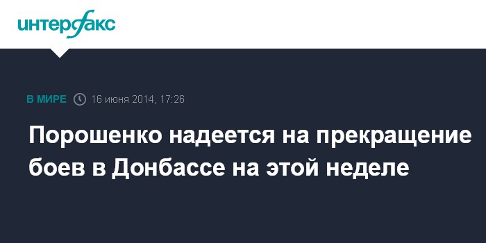 Москва. 16 июня. INTERFAX.RU - Президент Украины Петр Порошенко рассчитывает, что боевые действия на востоке страны будут прекращены уже на этой неделе.