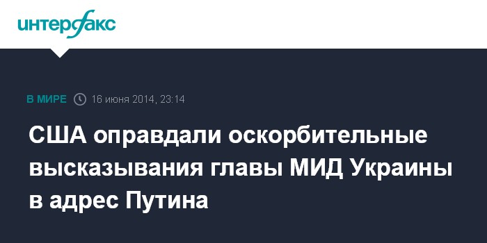 Москва. 16 июня. INTERFAX.RU - Государственный департамент США воздержался от осуждения оскорбительных реплик со стороны премьер-министра Украины Арсения Яценюка и и.о.главы МИД этой страны Андрея Дещицы в адрес граждан и руководства РФ, заявила представитель госдпепа Дженнифер Псаки.