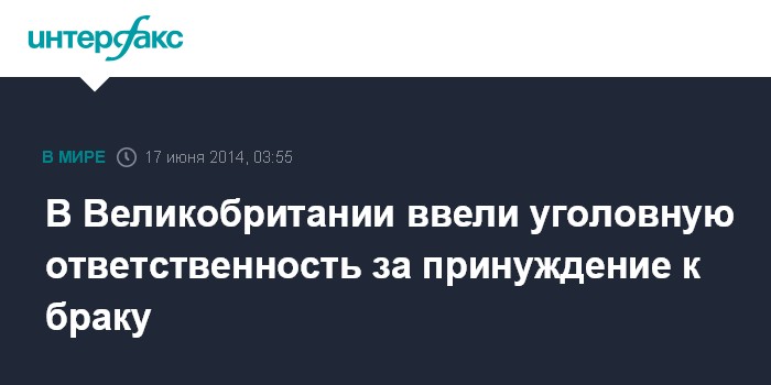Москва. 17 июня. INTERFAX.RU - В Англии и Уэльсе вступил в силу закон, предусматривающий уголовную ответственность за принуждение к браку, сообщает BBC.