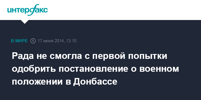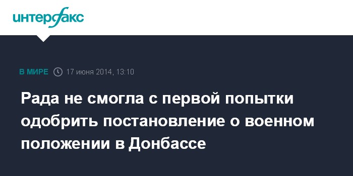 Москва. 17 июня. INTERFAX.RU - Верховная рада Украина во вторник обсуждает целесообразность принятия обращения к Петру Порошенко в связи с событиями на юго-востоке страны, в котором президенту предлагается ввести военное положение в Донецкой и Луганской областях. Однако согласовать его пока не удалось.