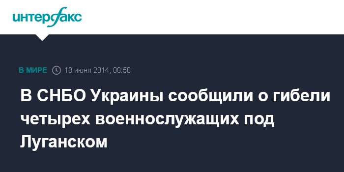 Москва. 18 июня. INTERFAX.RU - Четверо военнослужащих погибли в окрестностях Луганска 17 июня, сообщил секретарь Совета национальной безопасности и обороны Украины Андрей Парубий.
