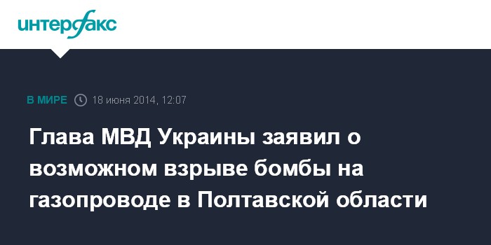 Москва. 18 июня. INTERFAX.RU - Причиной взрыва на газопроводе "Уренгой-Помары-Ужгород" в Полтавской области могло быть взрывное устройство, заложенное под основание бетонной опоры трубопровода, сообщил министр внутренних дел Украины Арсений Аваков.