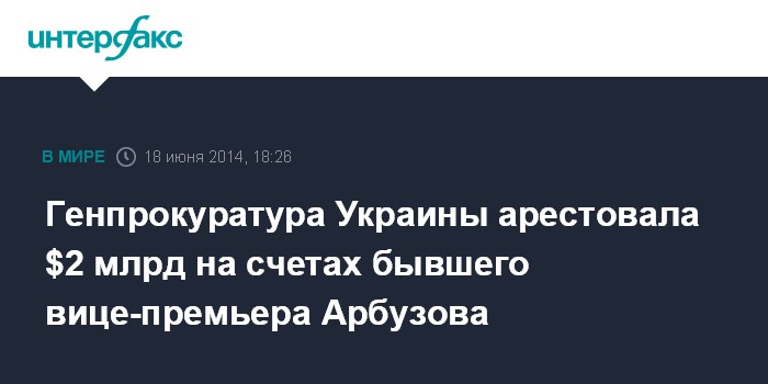 Москва. 18 июня. INTERFAX.RU - Генеральная прокуратура Украины наложила арест на счета бывшего вице-премьера Сергея Арбузова, на которых хранились облигации государственного займа на суму почти $2 млрд и 1,2 млрд гривен, заявил заместитель генерального прокурора Алексей Баганец.