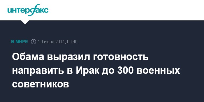 Москва. 20 июня. INTERFAX.RU - Президент США Барак Обама выразил готовность направить в Ирак до 300 военных советников, чтобы помочь правительственным силам безопасности отражать атаки исламских боевиков, захвативших около трети страны, сообщает Los Angeles Times.